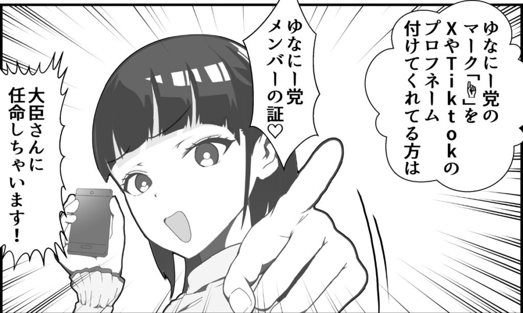 ゆなにー党に入って大臣さんになる方法はすっごく簡単! Xのプロフネームにゆなにー党マーク『☝』をつけるだけッ! つけてくれた人には... 大臣って呼ぶし、大臣さんだけにこうやってリプ返してるッ⸜❤︎⸝ ゆなにー党マーク『☝... -